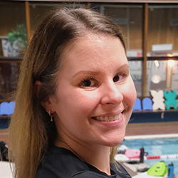 I simhallen en våning upp står simtränaren Sara Mårtensson och håller koll på ungdomarna i 25-metersbassängen.
