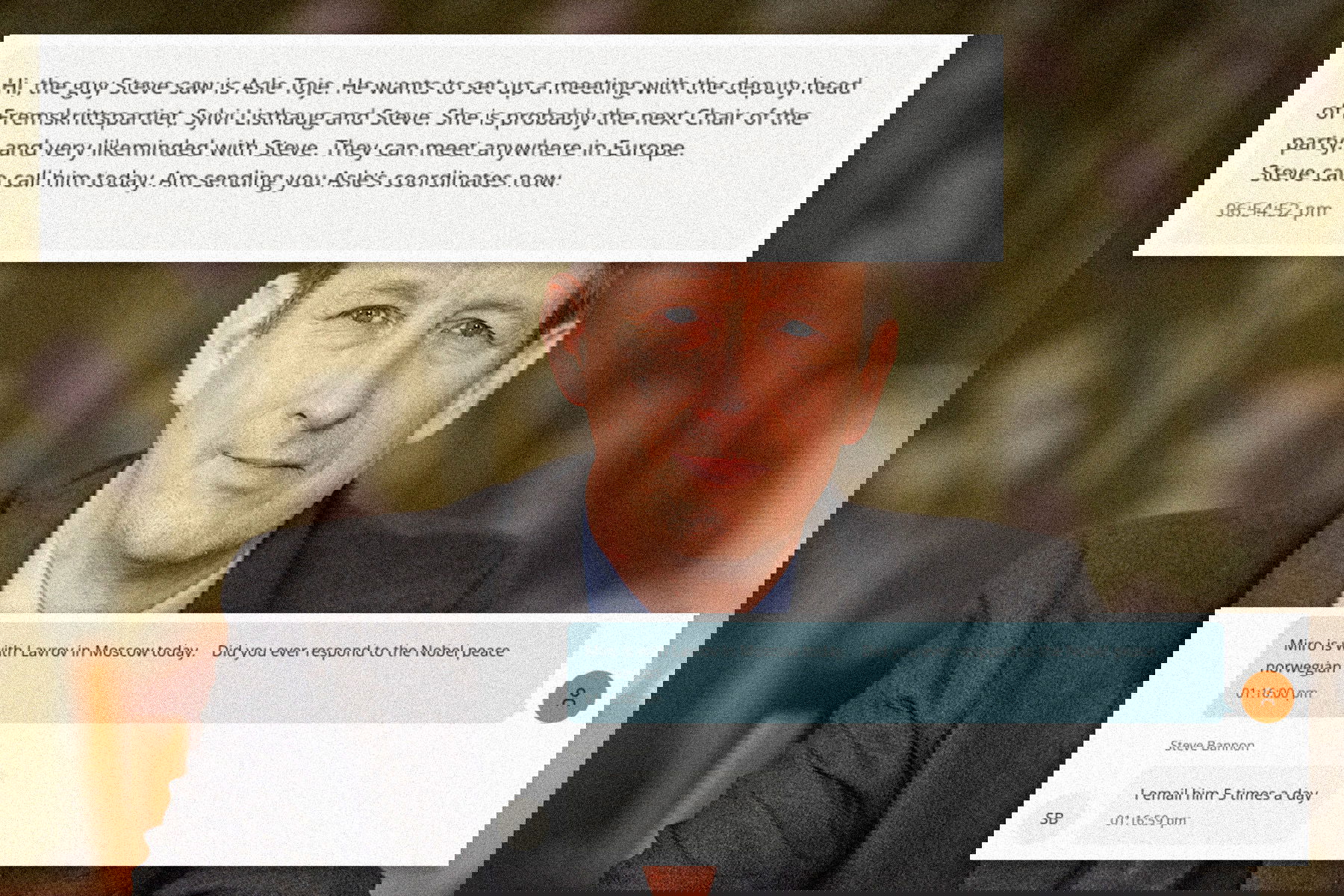 Därefter vidarebefordrar Epstein numret till Steve Bannon, och skriver att ”Nobelkillen vill sätta upp ett möte med dig och partiledaren”, vilket troligen åsyftar Sylvi Listhaug. Epstein skriver också att ”Donalds huvud skulle explodera om han visste att du var polare med snubben som på måndag kommer avgöra Nobels fredspris”.