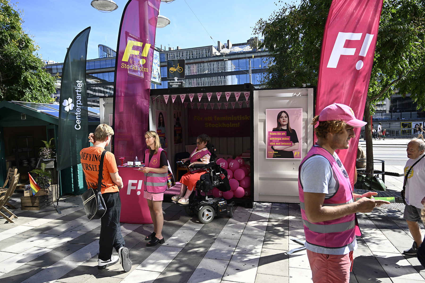 Anna-Karin Hatts publik behövde solskydd under sitt tal i Almedalen. Foto: Jessica Gow/TT.