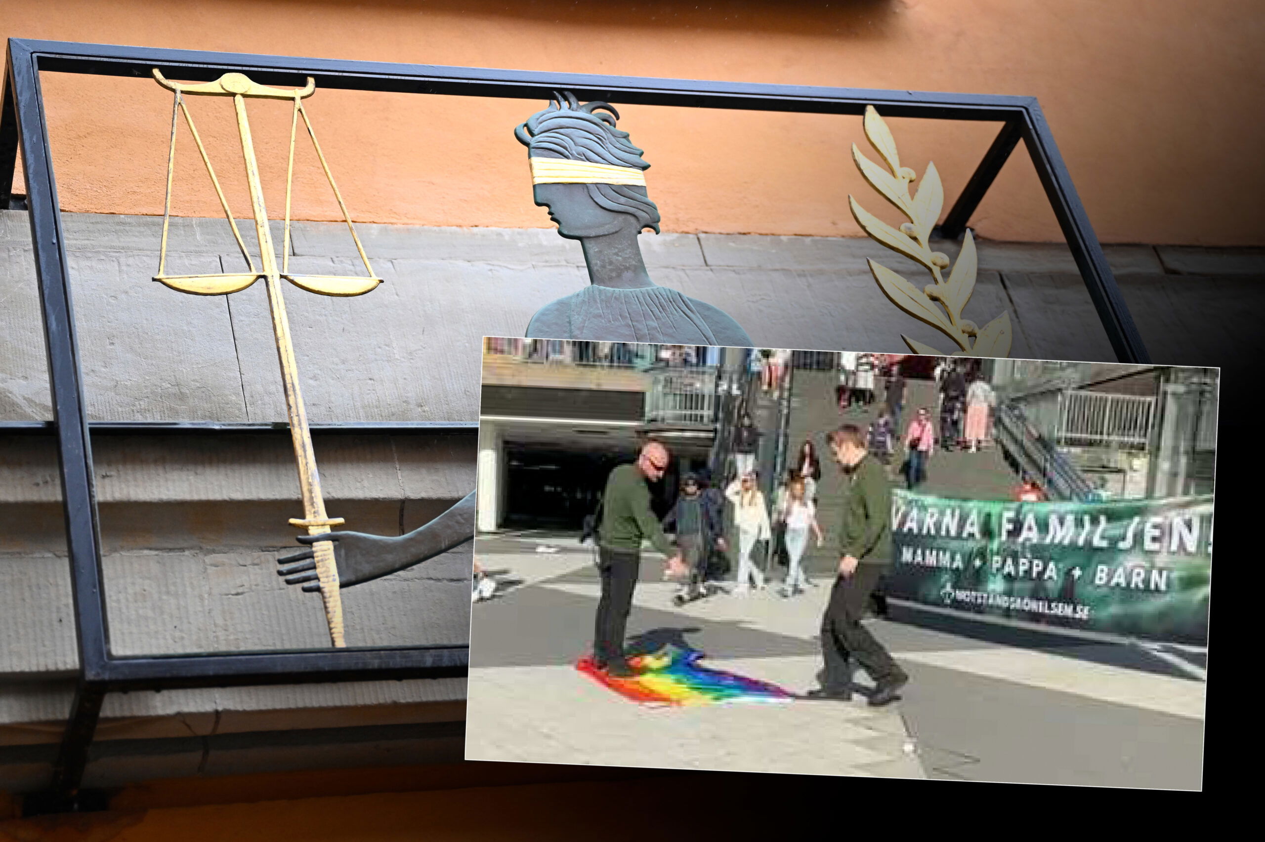 Symbolen Fru Justitia i Stockholms tingsrätt. En film visar hur NMR-aktivisterna trampar på regnbågsflaggan. Foto: Henrik Montgomery/TT, Polisens förundersökning.