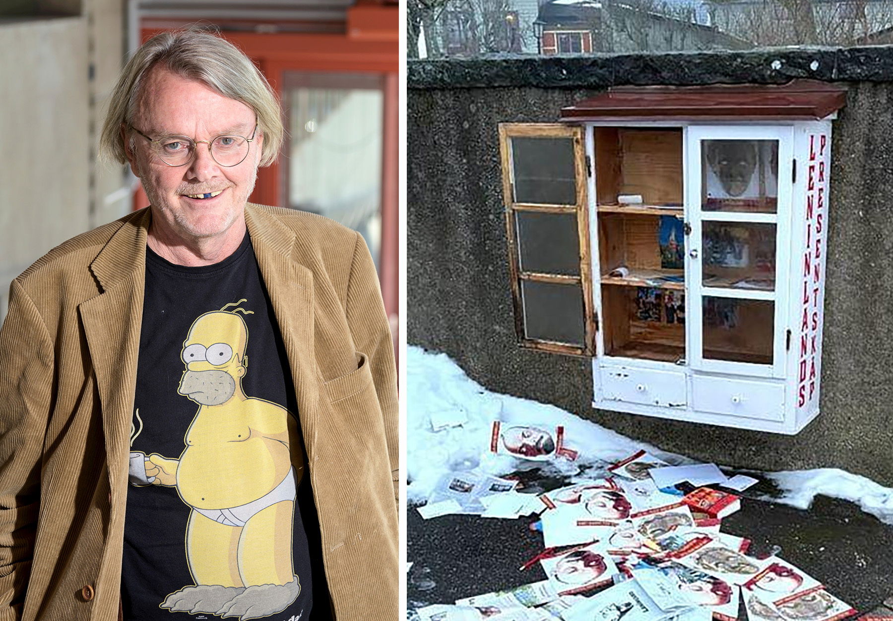 Två klistermärken med budskapet ”svenskar är vita” satt uppklistrade på informationsskylten utanför, och masker med den sovjetiska ledaren Vladimir Lenins ansikte hade rivits ut på gatan från Leninlands ”presentskåp”.