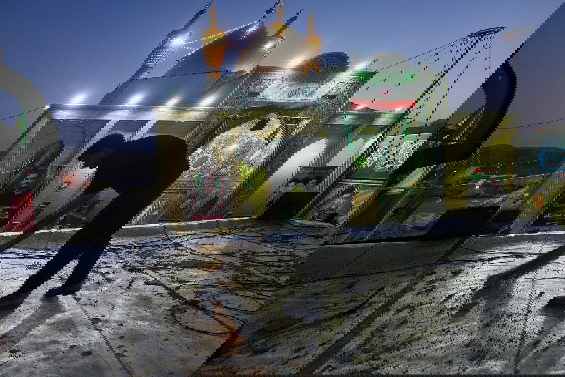 En arbetare rengör det historiska Grand Hosseiniyeh-komplexet i iranska Zinjan, som enligt myndigheter träffades av amerikansk-israeliska flyganfall den 31 mars. Foto: Francisco Seco/AP/TT.
