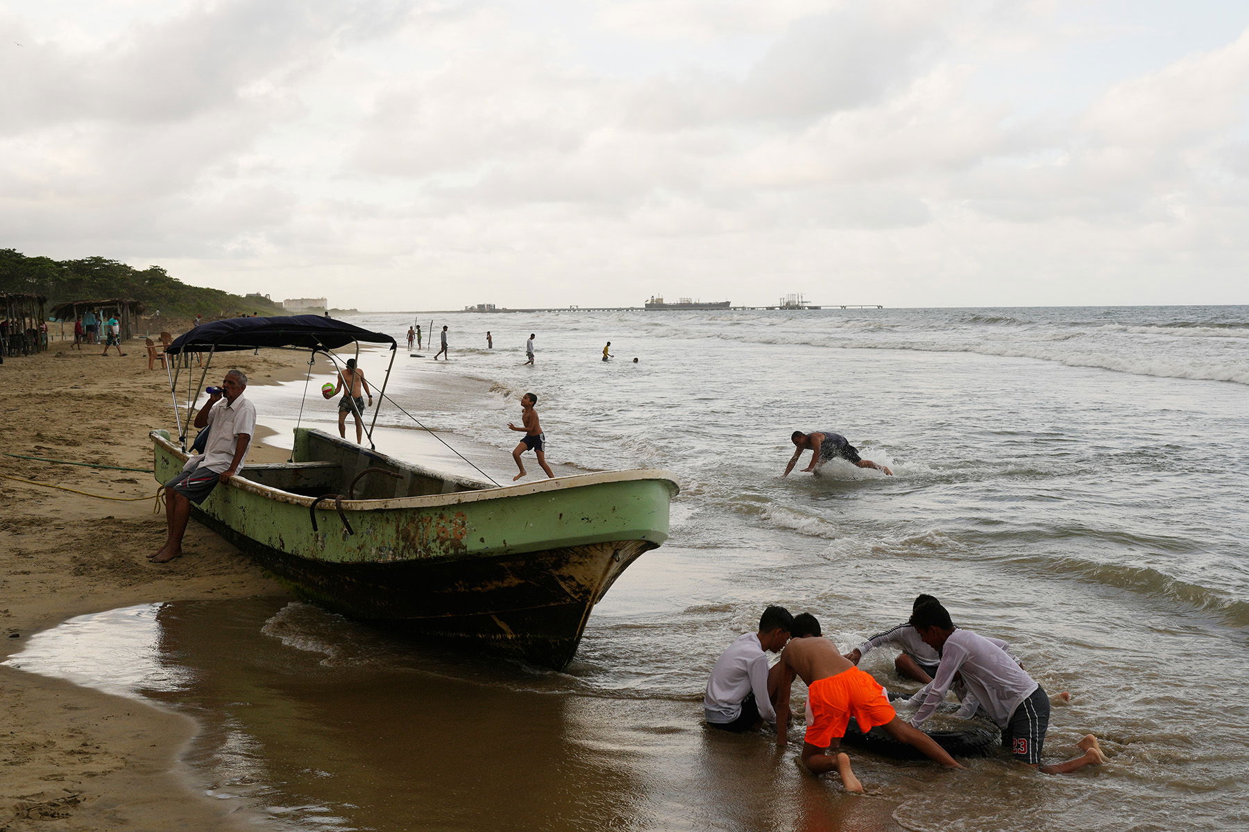 Bad. Barn leker på stranden nära hamnen El Palito i Puerto Cabello, som används för att skeppa olja. Foto: Matias Delacroix/AP/TT.