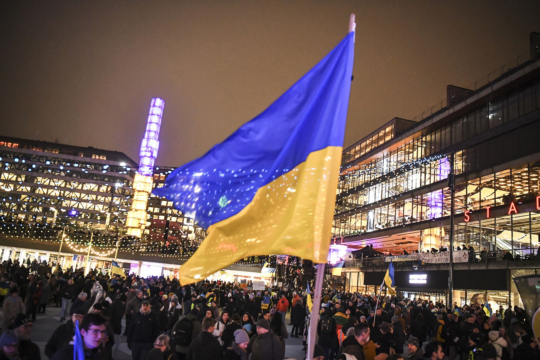 På treårsdagen av Rysslands invasionskrig i Ukraina hålls en partipolitiskt oberoende demonstration, ”Sverige står upp för Ukraina”, på Sergels torg i Stockholm, i februari i år. Foto: Oscar Olsson/TT.