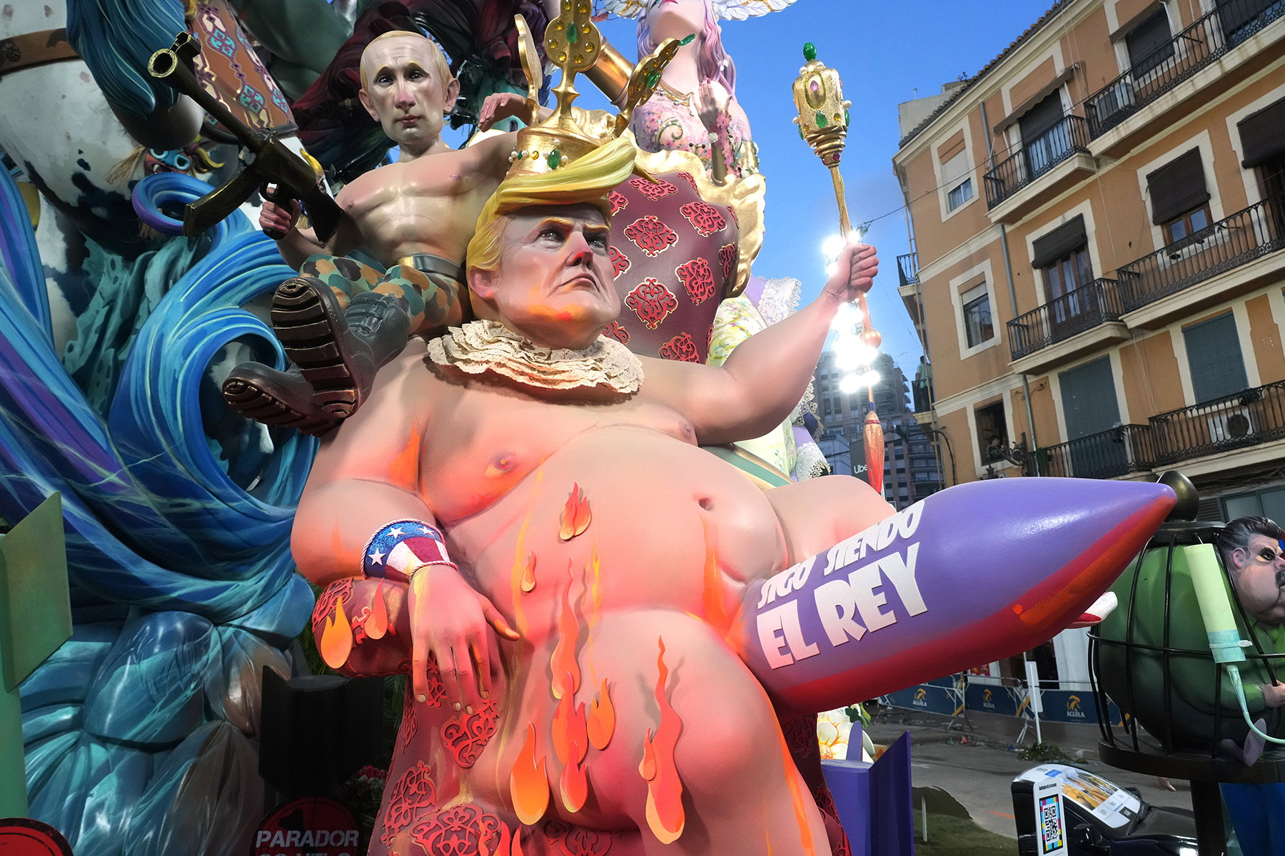 Kartongskulpturer (”ninots”) som föreställer USA:s president Donald Trump och Rysslands president Vladimir Putin visas upp innan de bränns under Fallasfestivalen i Valencia i Spanien, den 19 mars 2026. Foto: Alberto Saiz/AP.