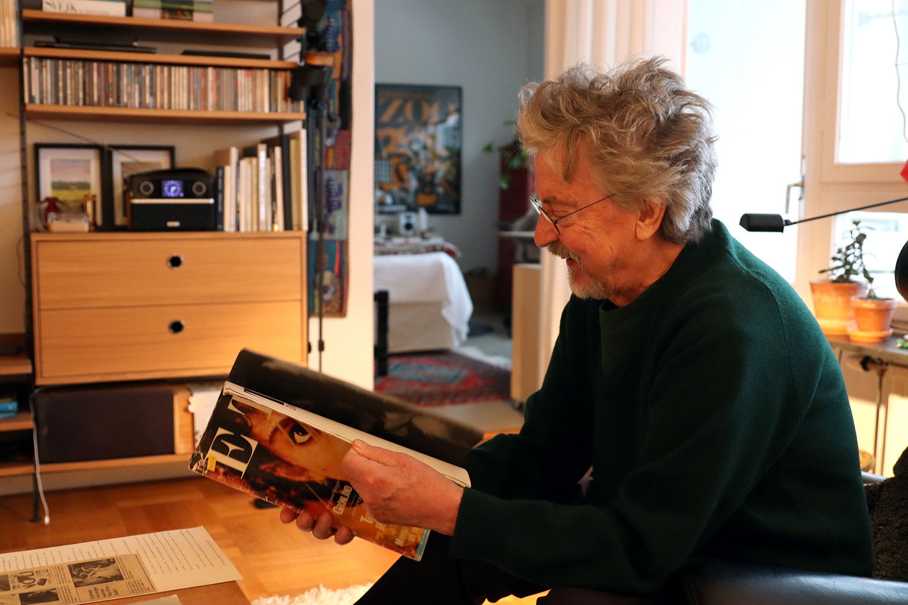 Ett annat uppslag visar ett vänsterborgerligt vardagsrum med välfylld bokhylla, röd lädersoffa och en expressionistmålning på väggen.